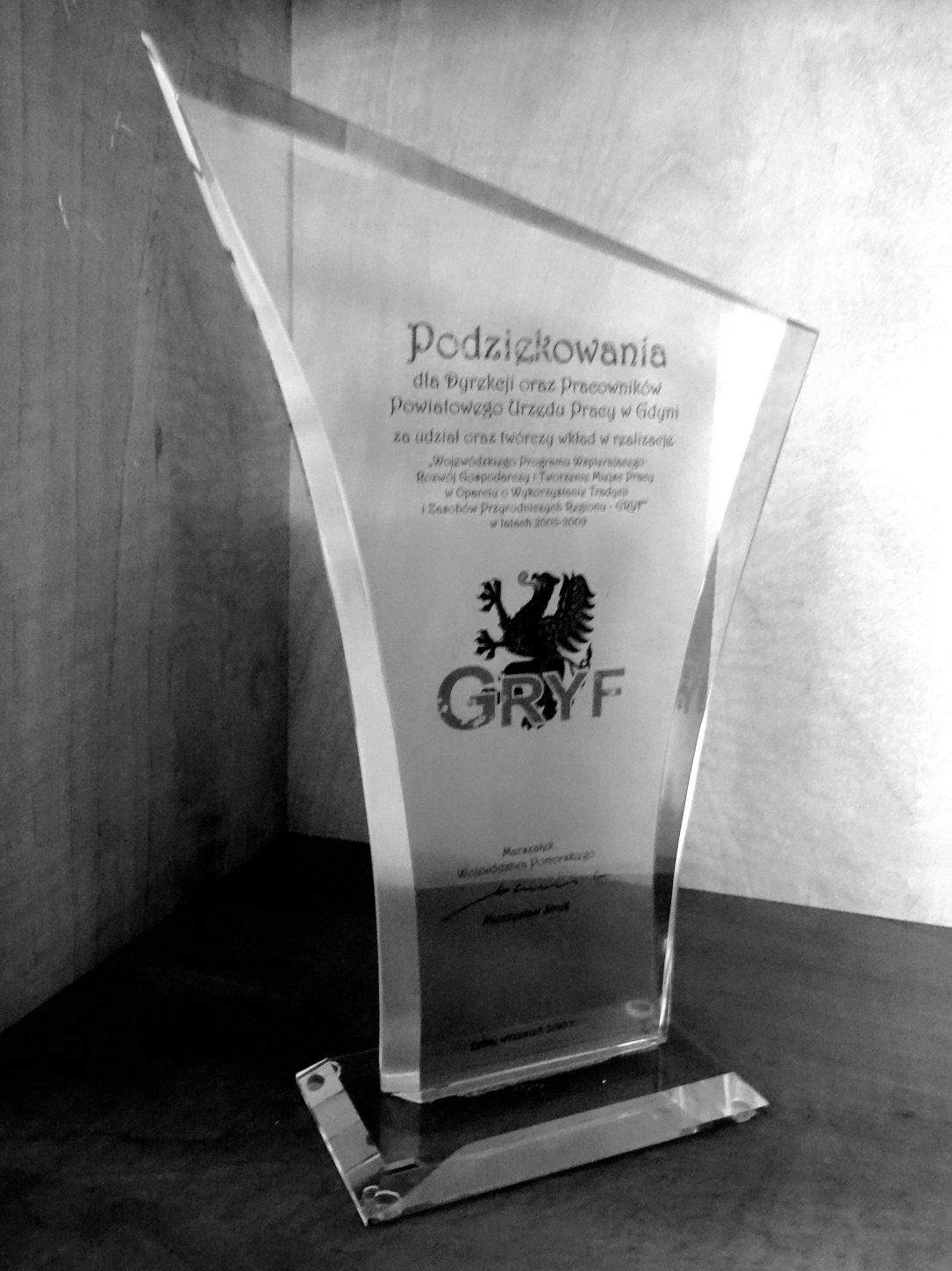 Marszałka Województwa Pomorskiego za udział oraz twórczy wkład w realizację "Wojewódzkiego Programu Wspierającego Rozwój Gospodarczy i Tworzenie miejsc Pracy w Oparciu o Wykorzystanie Tradycji i Zasobów Przyrodniczych Regionu - GRYF"