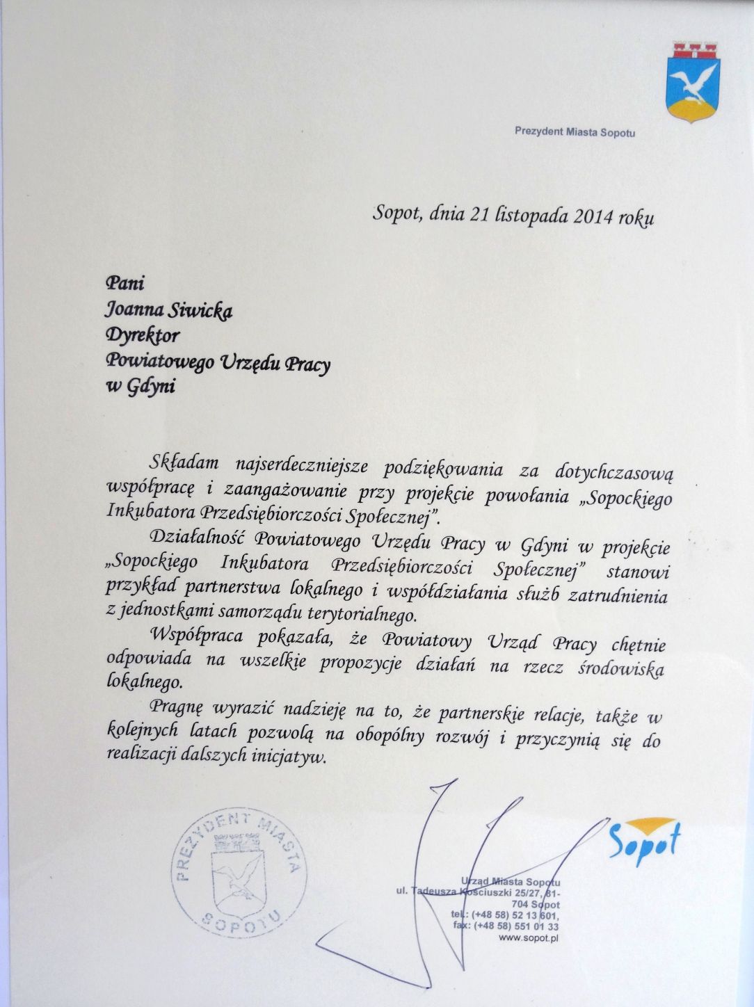 za współpracę i zaangażowanie przy projekcie powołania "Sopockiego Inkubatora Przedsiębiorczości Społecznej"