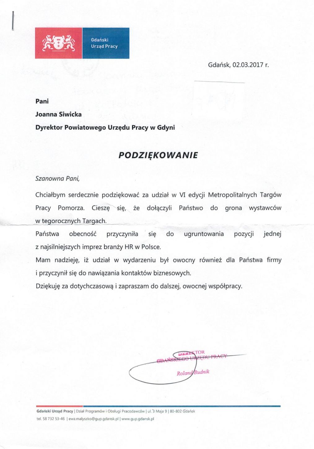 Dyrektora Gdańskiego Urzędu Pracy za udział w VII edycji Metropolitalnych Targów Pracy Pomorza